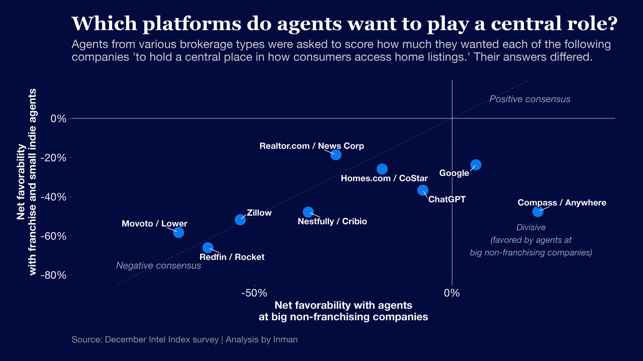Agents with big, non-franchising models were much more likely to view Compass as a desirable central player in the way that consumers access home listings.