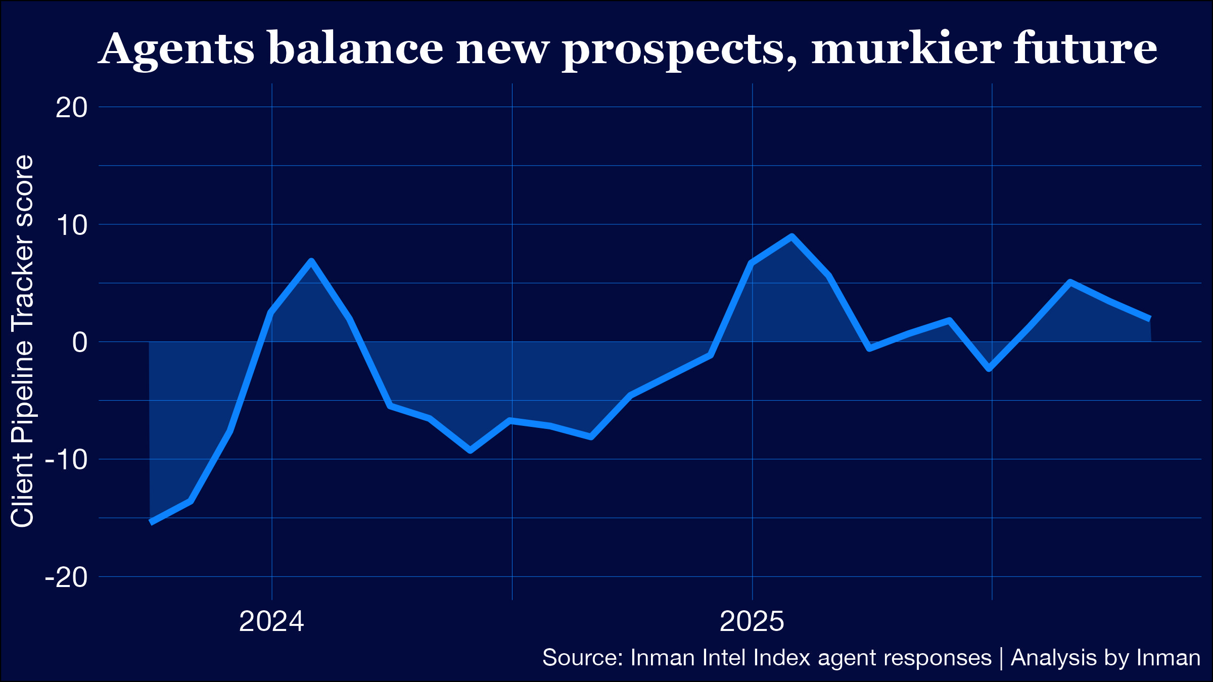 - positive score reflects a market in which client pipelines have been improving, or are widely expected to improve in the next 12 months. Intel The That’s a bit lower than where the industry stood in September 2024, the first time Intel surveyed agents about their pipelines.For each of the four individual components that go into the score, results as high as