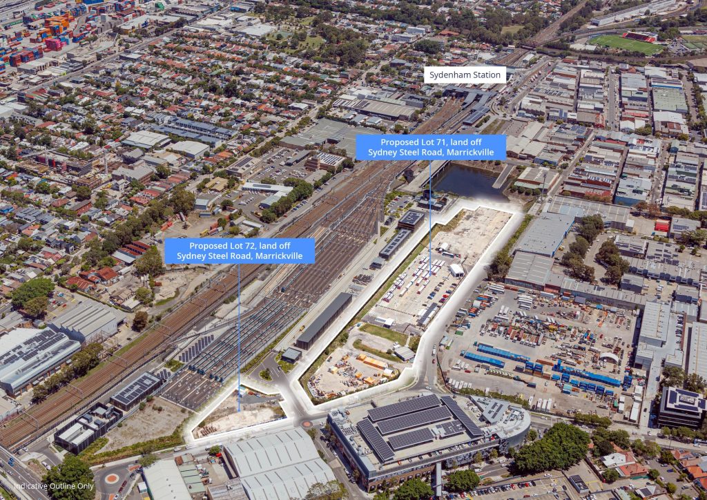The mega parcels surrounding Sydenham station – listed on realcommercial.com.au as Proposed lot 61, 11 Sydenham Road and proposed lots 71 and 72, off Sydney Steel Road – are offered by Colliers’ Trent Gallagher and Michael Crombie.