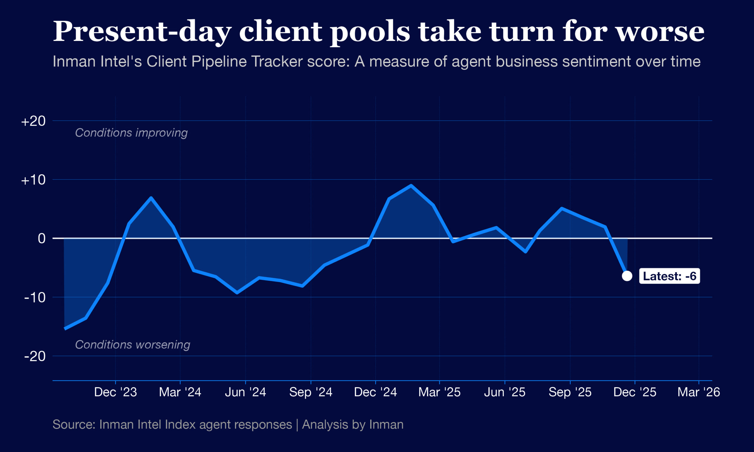An extremely negative combined score, on the other hand, falls closer to -20. That’s a bit lower than where the industry stood in September 2024, the first time Intel surveyed agents about their pipelines.